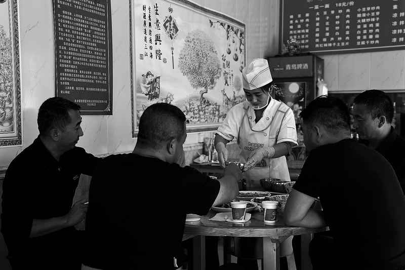 ● 食客正在用餐 “ 菜来啦,这是烧豆腐,这是蒜薹炒肉。你们慢慢品尝… … ”
