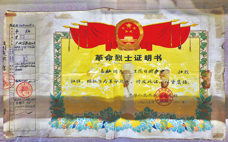 昆仑关战役博物馆收藏的烈士证书。