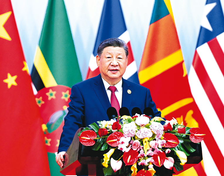 金秋时节,天朗气清。国家会议中心会场内,各国国旗和联合国旗帜组成恢弘旗阵。
