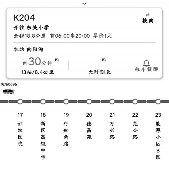 近日,有市民反映,往返于新区北环路公交充电站和老城区东关小学的K204路公交车,其公交路线牌与易公交App显示不一致,给不经常坐公交车的市民带来不便。记者随即乘坐了开往东关小学方向的K204路公交车,发现易公交路线显示“新区第一小学—贵人峁二号站—贵人峁一号站—贵人峁站—全民健身运动中心”,而在位于新区第一小学站点的路线牌则显示“新区第一小学—新区水务中心—全民健身运动中心”;易公交显示“妇幼医院—新区高级中学—行知南路—德昌苑—万兴路—范公路—能源小区B区”,公交站牌却显示“妇幼医院—翰林府—能源小区B区”。