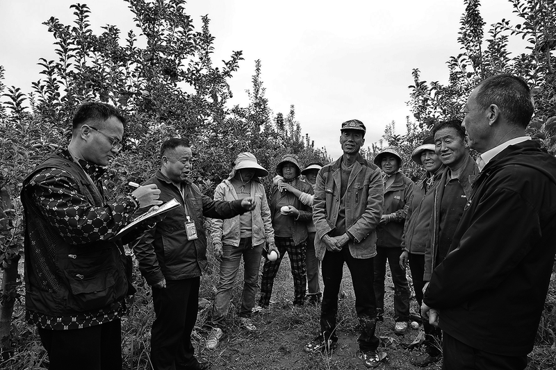 近日,在洛川县黄章便民服务中心方相村的苹果园里,中国太平洋财产保险洛川支公司的工作人员正根据保单,对群众购买的政策性农业保险进行回访调查。