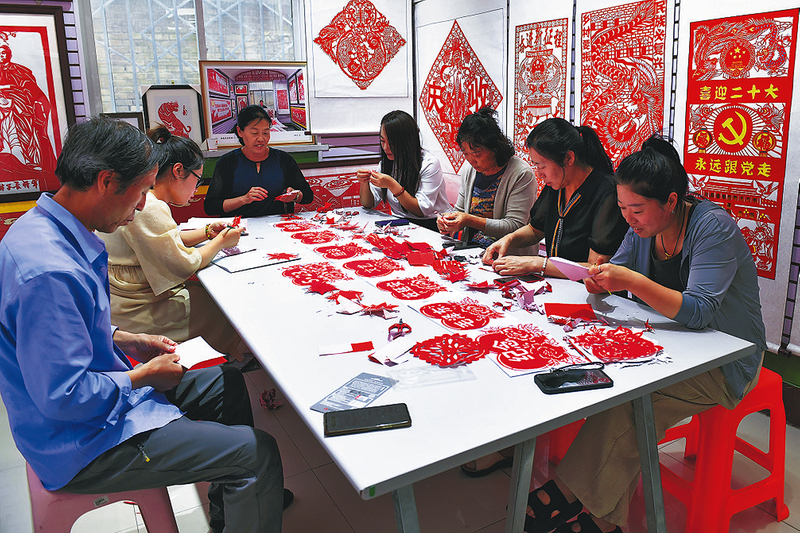 ● 子长市瓦窑堡街道齐家湾社区剪纸传习所里,居民们认真学习剪纸
