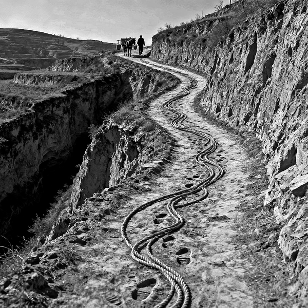 然而,井坡——这个在陕北旱塬农村随处可见、悬挂在黄土高原上用于驮水的普通小路,在人们的心目中永远保留着重要的地位。那回荡在井坡上的少年脆亮童音,那在井坡上回啭动听的唢呐余音,那井坡上一年四季不同的景色,永远在我——一个远离故乡的游子内心深处绵延不绝。那一道道麻绳似的缠绕在黄土高坡上的井坡,将我浓郁的一腔乡愁永远、永远紧紧地牵扯着。