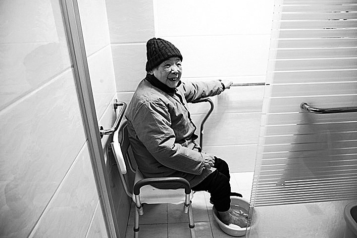 2024年2月1日,江苏省常州市钟楼区荷花池街道居民钱金秀老人在经过适老化改造的卫生间内洗脚。 新华社发 陈暐 摄        新华社“新华视点”记者