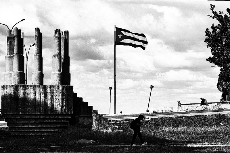 10月29日,行人从古巴首都哈瓦那街头飘扬的国旗旁走过。
