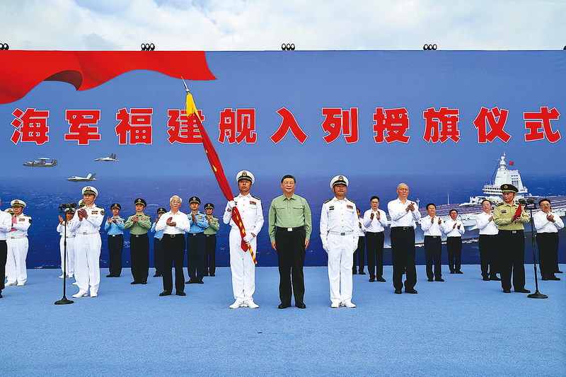 下午4时30分许,入列授旗仪式开始,全场高唱中华人民共和国国歌,五星红旗冉冉升起。仪仗礼兵护卫着八一军旗,正步行进到主席台前。习近平将八一军旗授予福建舰舰长、政治委员。福建舰舰长、政治委员向习近平敬礼,从习近平手中接过八一军旗。习近平同他们合影留念。入列授旗仪式在中国人民解放军军歌声中结束。
