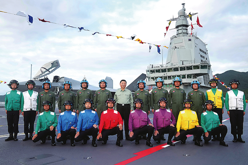 ● 11月5日,我国第一艘电磁弹射型航空母舰福建舰入列授旗仪式在海南三亚某军港举行。中共中央总书记、国家主席、中央军委主席习近平出席入列授旗仪式并登舰视察。这是习近平同舰载机飞行员、航空保障人员合影留念。 新华社记者 李刚 摄 新华社三亚11月7日电 (记者 梅常伟)我国第一艘电磁弹射型航空母舰福建舰入列授旗仪式5日在海南三亚某军港举行。中共中央总书记、国家主席、中央军委主席习近平出席入列授旗仪式并登舰视察。