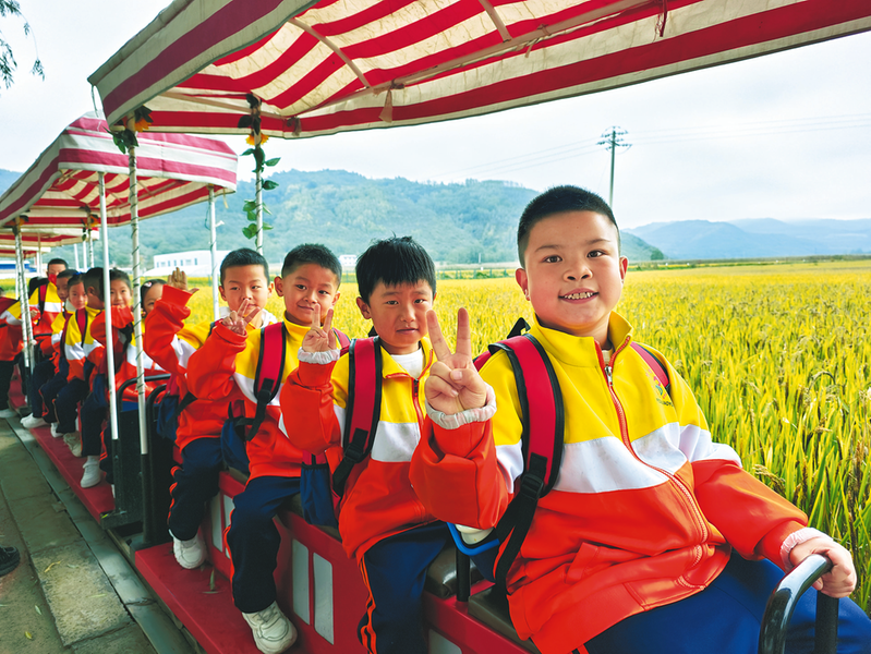 ▲ 学生乘坐小火车穿梭于田园之间 刘采羽 摄