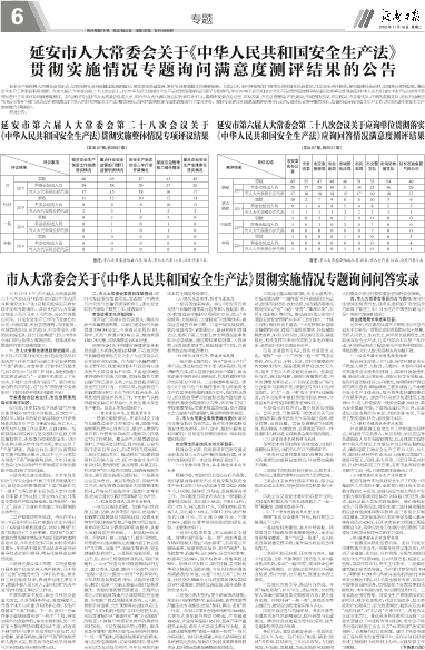 延安市人大常委会关于《中华人民共和国安全生产法》 贯彻实施情况专题询问满意度测评结果的公告