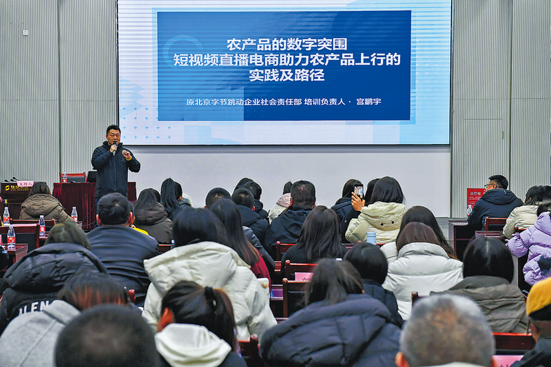 ● 抖音讲师宫鹏宇在授课 记者 赵合欢 摄 本报讯(记者 白雪 赵合欢)11月19日,“延安好物带不停”直播带货助农行动主播培训在延安正式启动。本次培训由中央网信办传播局指导,陕西省委网信办、延安市委网信办、陕西广电融媒体集团(台)联合主办,吸引了100余名学员参与,其中,既有延安本地农户、非遗文创从业者、返乡青年,也有村集体经济负责人等扎根乡村的实干力量,大家齐聚一堂学习直播电商实战技能,为家乡好物出山“充电赋能”。