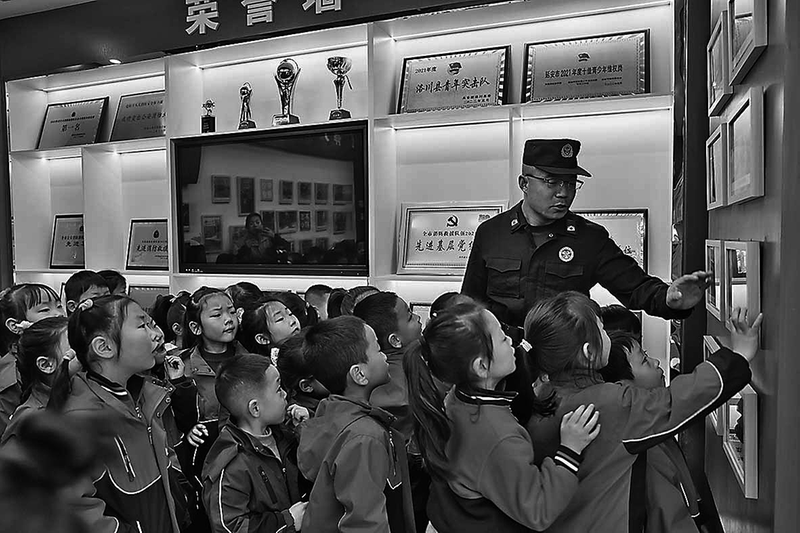 体验结束后,孩子们来到大队荣誉室,悬挂的锦旗、陈列的奖牌以及消防员参与救援的照片,都让孩子们驻足凝视。消防员讲起了照片里的救援故事,听到叔叔们冒险救人的事,孩子们的小脸上满是崇拜。