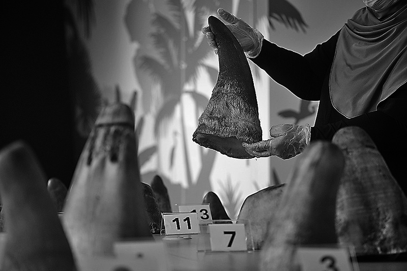 11月18日,一名国家公园局工作人员在新加坡野生动植物法证中心向媒体展示查获的犀牛角。