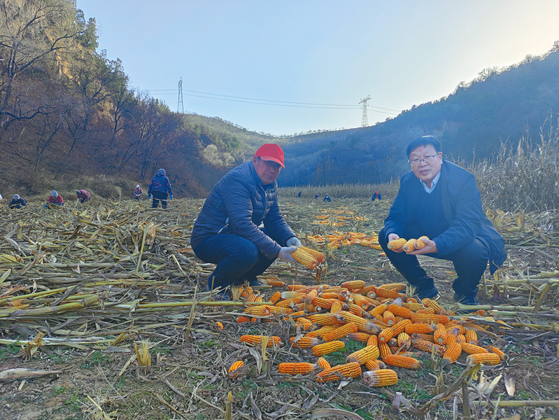 张晓辉(右)与基地负责人在玉米收获现场