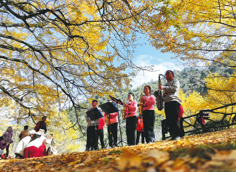 11月23日,萨克斯爱好者在桐子坳村银杏树下为游客表演。