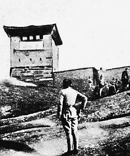 ● 敌军修筑的碉堡 越过九峰山时,行军非常艰苦。我们冒雨行进在九峰山崎岖的羊肠小道上,这里没有村庄,看不到一户人家;部队没有饭吃,饥饿、寒冷和疲劳考验着每一个红军战士。但当我们得知,三军团、中央和军委纵队及其他兄弟部队已经通过了第三道封锁线,走到前面去了,于是大家互相鼓励,不顾一切地往前赶。我的脚就在过九峰山时磨破了,但仍坚持随队行动。
