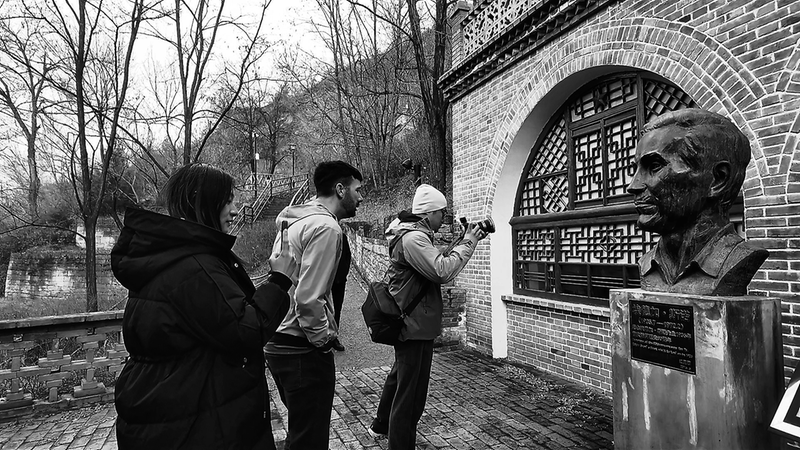 ● 11月16日,安柏然(中)和团队成员在延安红星园国际文化交流园区参观 “ 我终于又回到了这里。”11月16日,驻足在延安清凉山下,来自新西兰的安柏然操着一口流利的汉语说,“这次采访弥补了4年前的遗憾。”