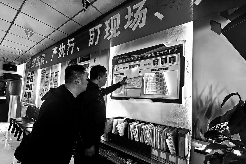 “10月份咱们生产二班被评选为‘优秀班组’,区队奖励班组2000分,再加上‘优秀员工’奖励的300分,光我个人就分到435分,1分相当于2.2元,奖励在当月绩效工资中兑现,你看,奖励了975元。”11月30日,在黄陵矿业一号煤矿掘进四队厂务公示栏前,刚升井的职工吴高照挤在人群最前面,指着公示单上的数字跟工友们算起了“收益账”。