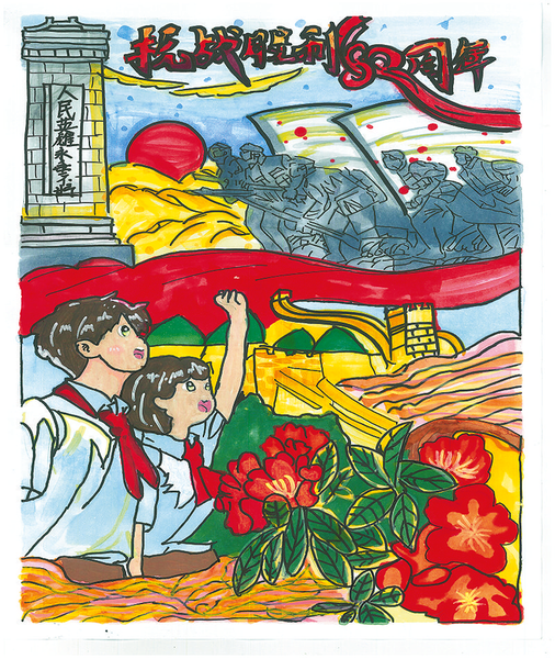 这幅作品以“抗战胜利80周年”为核心,旨在致敬先烈、传承红色记忆。画面左侧融入人民英雄纪念碑元素,镌刻“人民英雄永垂不朽”,呼应抗战先烈的牺牲与奉献。背景中灰色调的抗战军民群像,还原烽火岁月的峥嵘,与红日、祥云形成明暗对比,象征黑暗过后的光明。前面佩戴红领巾的少年仰望致敬,传递后辈对历史的铭记与传承,长城、牡丹等元素则勾勒出如今的山河锦绣,寓意先烈守护的家国已繁花盛放。整体以红、黄为主色调,结合花海等意象,既致敬抗战胜利的光辉合飘带时刻,也表达青少年延续红色血脉、守护和平的初心。
