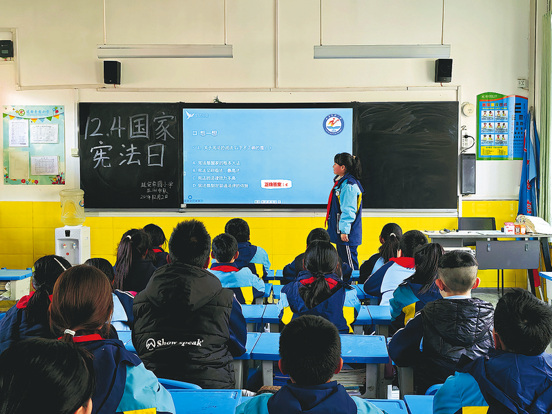 12月2日,各中队开展了“学宪法讲宪法,争做宪法小卫士”主题少先队活动课。队员们通过观看生动直观的法治短片、参与紧张有趣的宪法知识竞答、传唱朗朗上口的法治童谣等多种形式,深化对宪法的认知。辅导员老师们则引入真实案例,传授“大声拒绝、及时求助、有效自护”的具体方法,将法治教育融入互动体验,有效提升了队员们的规则意识与自护能力。