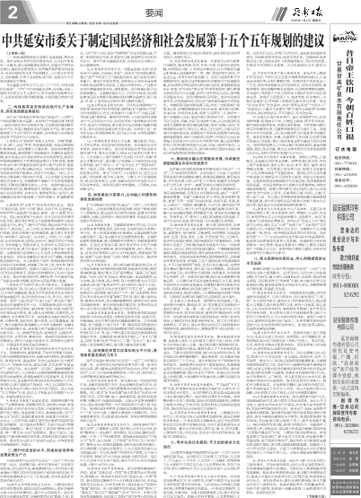 中共延安市委关于制定国民经济和社会发展第十五个五年规划的建议