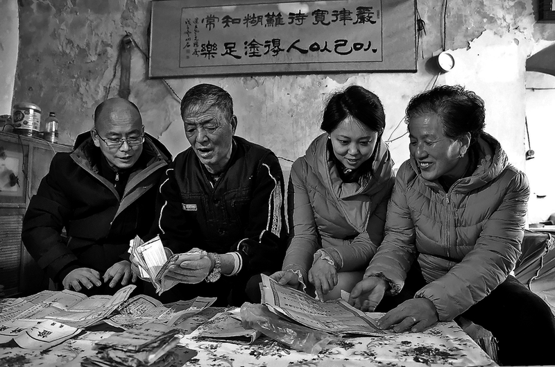 ● 赵建立(左二)向众人展示并讲述那几页厚重的家族记忆 李文振 摄 通讯员 李文振 王瑛 记者 贺秋平