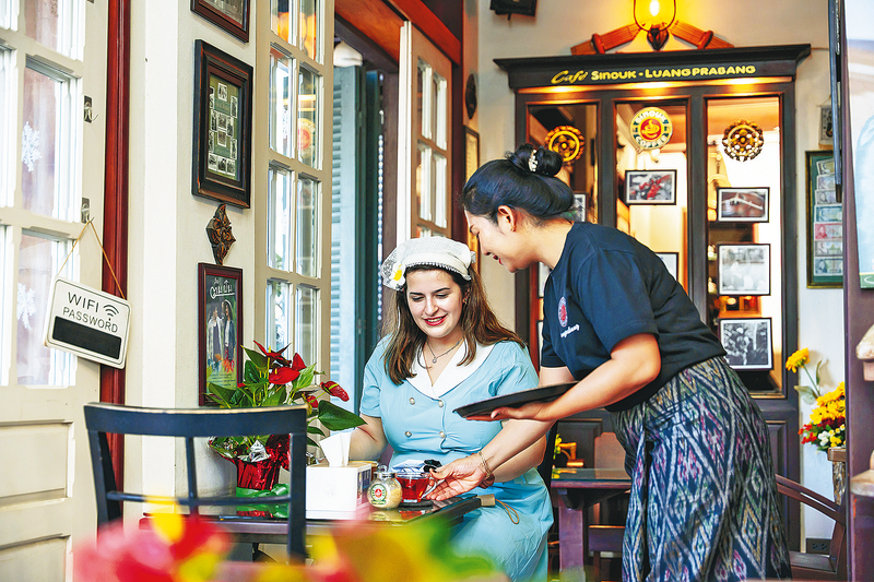在老挝琅勃拉邦一家咖啡店,服务员为顾客端上咖啡(2025年12月31日摄)。