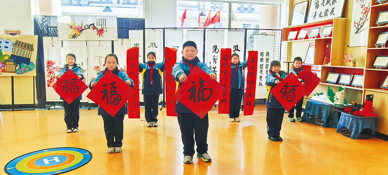 步入展区,浓郁的中华传统文化气息扑面而来。书法区内,师生们挥毫泼墨,一幅幅笔力遒劲的春联、一张张寓意吉祥的“福”字跃然纸上,笔墨流转间既有传统的法度,又洋溢着童真的意趣,字里行间满载着对新春的祈愿与祝福。