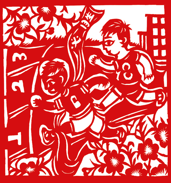 这幅剪纸以动态化的写实剪刻技法,将青少年奔跑运动的场景与体育节主题融合,人物舒展的肢体线条勾勒出冲刺的活力,背景的数字“123”、建筑轮廓与花卉纹样相映成趣,红色剪纸的热烈基调与体育节的昂扬氛围高度契合。