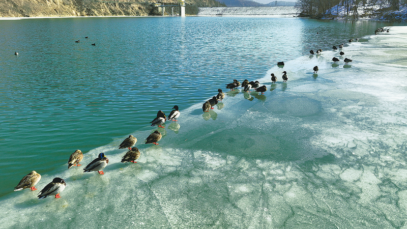 冬日正午,我市红庄水库呈现出一半碧波荡漾、一半冰凝如镜的景致。在暖阳照耀的冰水交界处,成群野鸭安然栖息,它们或漫步冰上,或悠然戏水,时而展翅嬉戏、互相追逐,为静谧的冬日画卷注入灵动生机,彰显出人与自然和谐共生的美好意境。