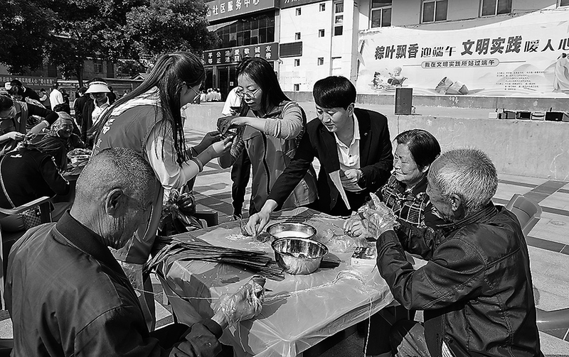● 强正社(右三)与社区居民一同参加包粽子活动 记者 李文振 摄 记者 贺秋平 通讯员 李文振 王瑛