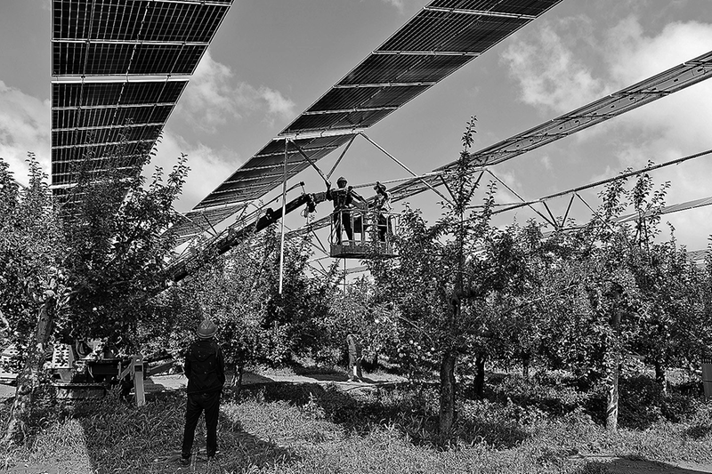 为消除群众“光伏板遮光影响收成”的顾虑,技术团队经过反复模拟与试验,将光伏支架整体抬升至3.5米到5.5米,并创新采用33米大跨度柔性支架,减少立柱数量,为果树留足生长空间。同时优化光伏板倾角与阵列间距,在地面铺设反光膜,利用反射光为果实背面补光。