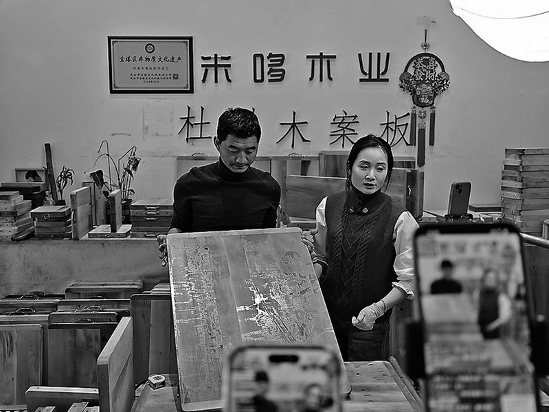 ● 高智玉夫妻在直播镜头前介绍杜梨木案板 通讯员 李浩楠 摄 “ 家人们看过来,咱这案板用的是地道杜梨木,木质细腻密度高,纹理清晰还含天然植物酸,对身体有益无害。”