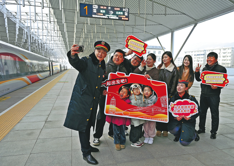 1月26日,铁路工作人员和乘坐G359次列车的乘客在延安站站台合影留念。