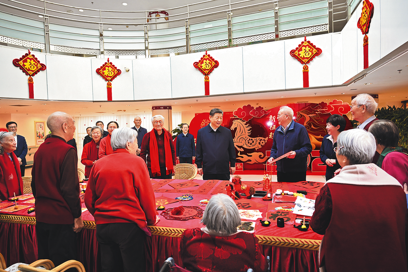 在银龄老年公寓,习近平详细了解老年人健康检查、康复训练、日常起居照料等情况。大厅里,一些老人正在写春联和福字,习近平来到他们中间,欣赏他们的创作,勉励他们老骥伏枥、老有所为,祝他们健康长寿、春节快乐。