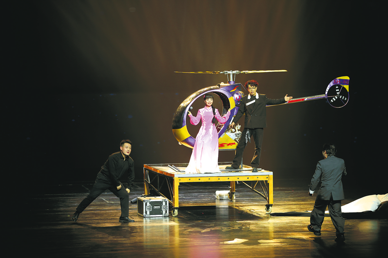 第三环节的“大变活人”将表演推向最高潮。舞台上放置着一个封闭木箱,周乐天走近木箱,轻轻挥动手中的幕布。幕布掀开时,木箱上方竟出现一架精致的直升机,而机上坐着的正是著名陕北歌手王二妮。当王二妮走下直升机向观众挥手致意时,现场掌声雷动,欢呼声不绝于耳,全场气氛彻底燃爆。