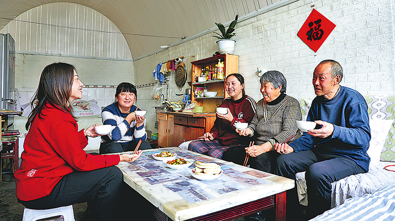 ● 村民薛凤英(右二)与邻里亲友共饮稠酒,同叙乡情 通讯员 李文振 摄 早春的陕北寒意料峭,窑洞里的土炕格外暖和。在宜川县丹州街道程落村,70岁的靳海堂还在羊圈忙碌,老伴薛凤英已熬上了冬日饭后必饮品——稠酒。