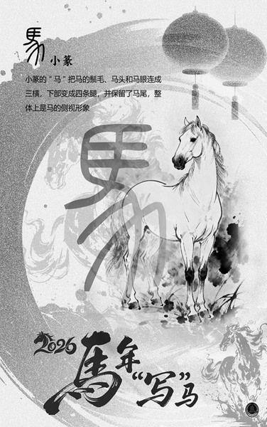 马年,让我们跟随“马”字的形象变迁,从甲骨文“马”的生动线条、金文“马”的浑厚质感… …再到楷书的简化规范,来感受文字带来的纯粹美感。