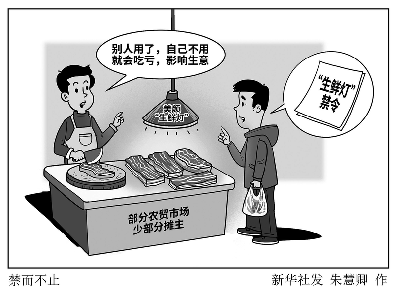 如今,新规施行逾两年,“新华视点”记者走访调查发现,在一些地方部分农贸市场和非固定摊位,“生鲜灯”仍有使用。