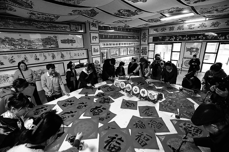● 金延安景区举行的义写春联活动中,群众在书写“福”字 任龙 摄