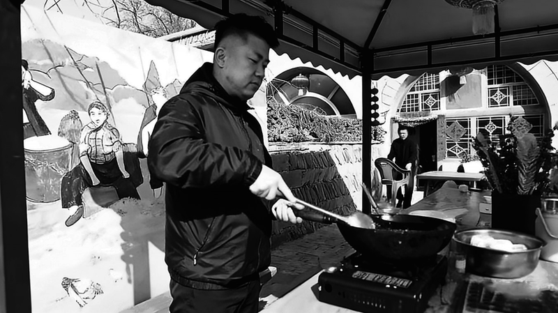 游客李现头一回体验做陕北年茶饭。他跟着村里的人炸丸子、蒸面花,忙活了半天。虽然手法生疏,丸子炸得大小不一,但他乐在其中。