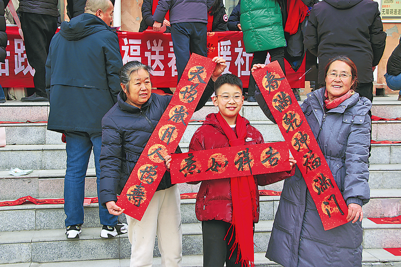活动现场,来自活动中心的书法老师和少年学员们铺开红纸、蘸满浓墨,一笔一画认真书写。不一会儿,“春回大地”“福满人间”等一副副寓意吉祥的春联便挂满了桌前。居民们围在旁边,有的轻声念着对联上的字,有的拿出手机拍照,还有小朋友踮起脚尖,好奇地看着大哥哥大姐姐写字。墨香飘散间,年味越来越浓。