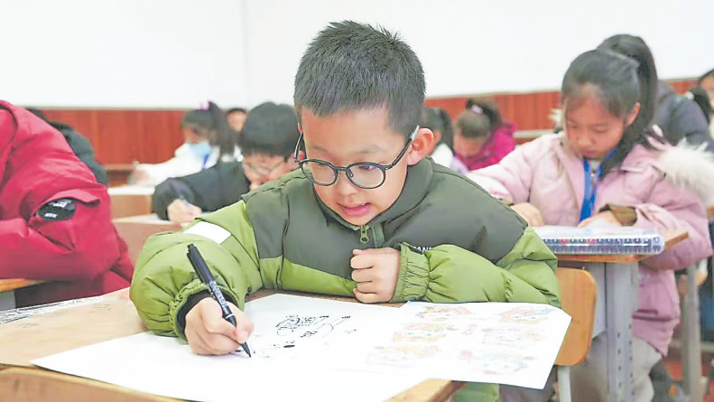 理论课一结束,孩子们便迫不及待地拿起画笔。画纸上,鲤鱼跃动,莲花盛开,胖娃娃抱着大元宝,老门神威风依旧。两个小时里,活动中心安静得只听见画笔沙沙作响。