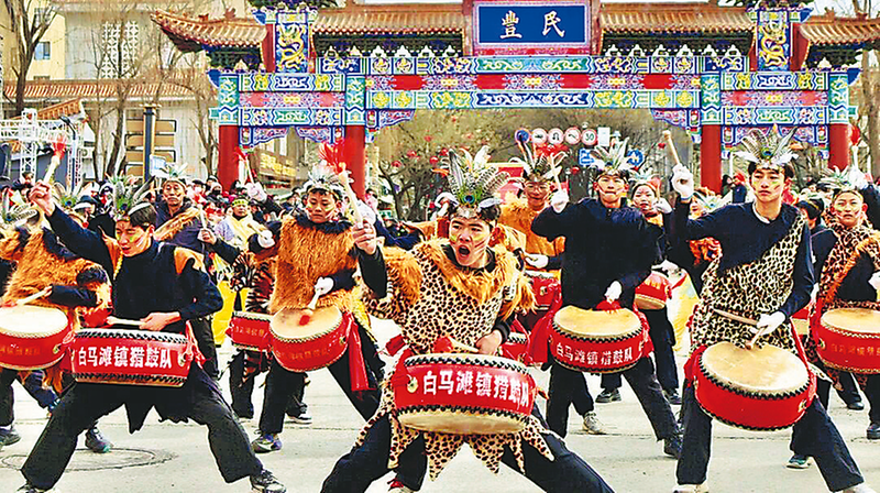 新春的鼓点,不只响在笔端与指尖,更回荡在黄龙的山川乡野间。每年元宵节的秧歌、猎鼓展演中,白马滩镇猎鼓队总是最吸睛的队伍之一。表演者面戴虎、豹、熊、狮面具,身着象征兽皮的服装,鼓槌上下翻飞,剽悍有力、气势十足,引得观众阵阵喝彩。