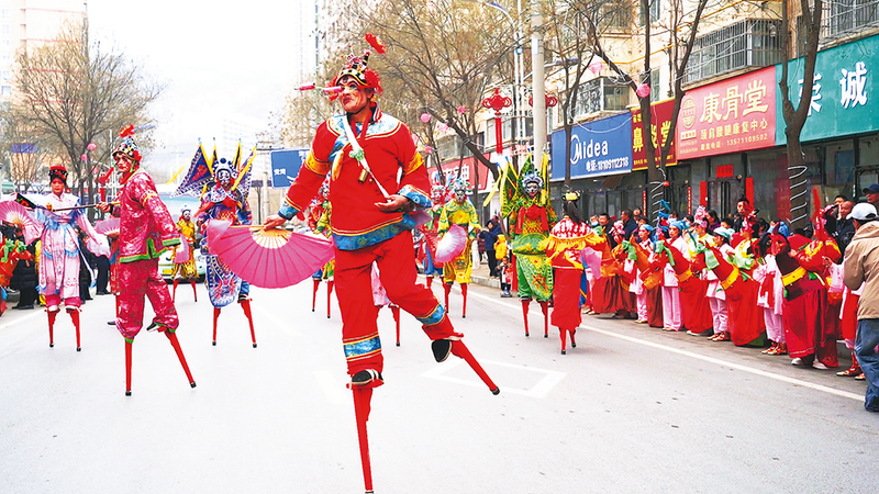 2月27日,农历正月十一,宜川县城锣鼓喧天、人潮涌动。洋溢着浓郁年味的民俗过街表演热闹上演,秧歌、竹马、高跷等表演轮番登场,吸引了众多群众齐聚街头,共庆新春。图为高跷队队员艺高胆大,步伐稳健自如。