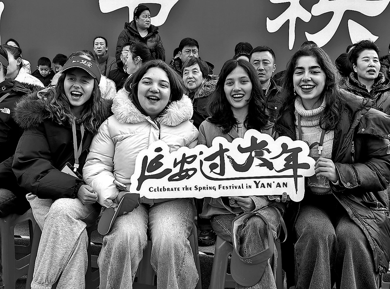 3月3日,在第43届“延安过大年”元宵节秧歌汇演活动现场的观众席间,来自西班牙的萨拉兴奋地和来自巴基斯坦的好朋友杜鹃交谈着。