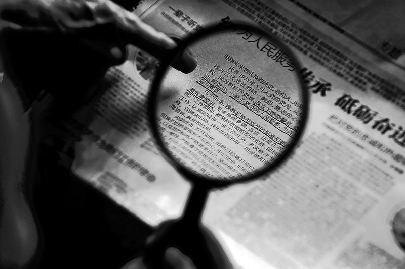 毕桂英借助放大镜阅读报纸