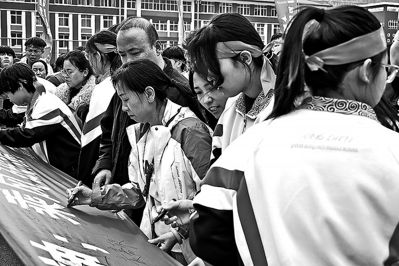 ● 家长和学生在加油横幅上签名 春风浩荡,战鼓催征。3月12日下午,延安东辰中学操场上一派热血沸腾的景象,该校初三中考百日冲刺动员大会正在举行。全体初三师生与家长齐聚一堂,初二全体师生也来到现场,为学长学姐加油助威。