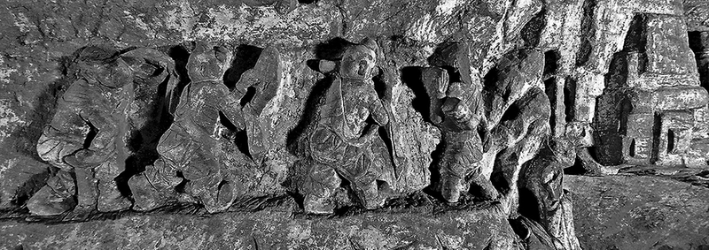 造像为红砂石质,由南向北依次排列。第一人为直立状,头束高髻,面部残损,上身着袒右臂长衣,下身穿紧腿短裤,胸腰间斜挂一束腰小鼓,右臂上举,五指并拢,手心向外,右臂自然下垂,五指并拢,手心向内,似做拍鼓状;第二人双手握长笛,做吹奏状;第三人双臂前伸高举,双手紧握三角形板状乐器,似做拍击状;第四人上身穿长袖衣,下身着紧腿短裤,弯腰伸臂屈腿做舞蹈状。另在石窟西壁和南壁大门西侧中部各发现一组着长袍拍镲、击鼓人物造像。这些造像均雕刻细腻、精致,人物形态各异、栩栩如生。