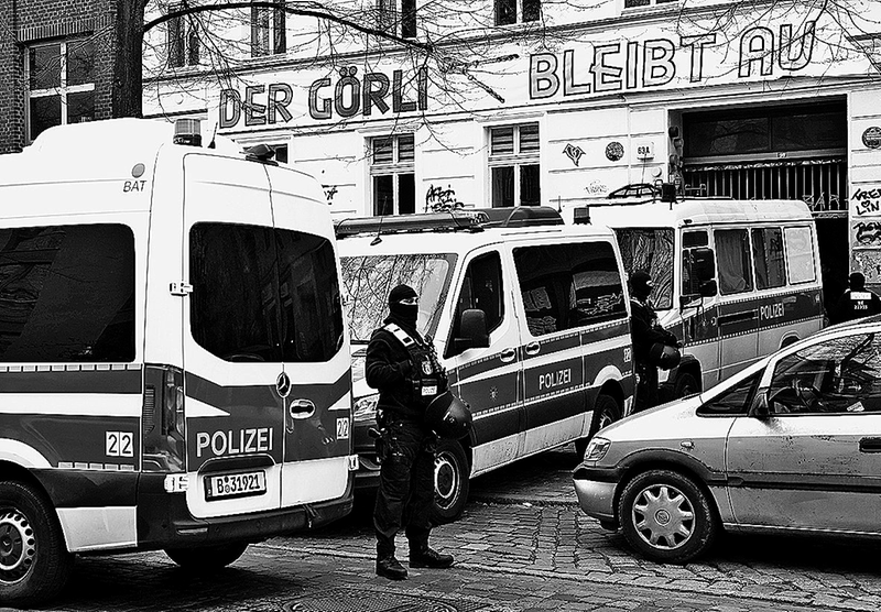 3月24日,在德国柏林克罗伊茨贝格区,警方人员封锁一处无政府主义者图书馆。
