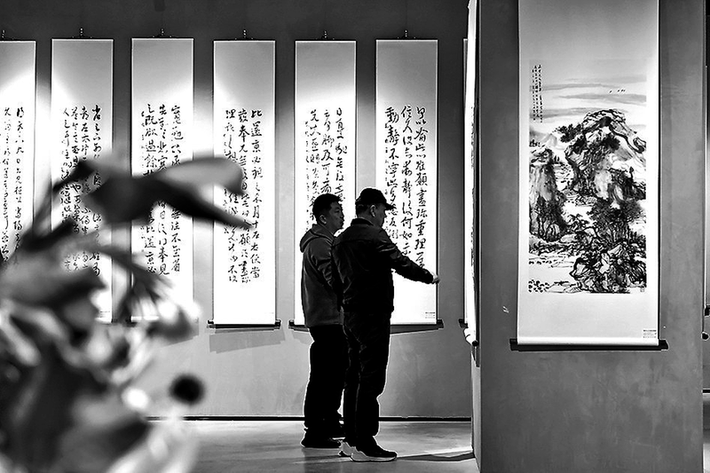 ● 与会嘉宾在展厅观展 记者 赵合欢 摄 本报讯(记者 刘晶 赵合欢 实习记者 邢珍珍)3月26日上午,“盛洪义书画篆刻展”在刘文西延安艺术馆正式开幕。